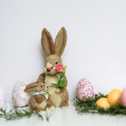 Set of 2 Mum And Baby Easter Bunny with Flowers Decoration