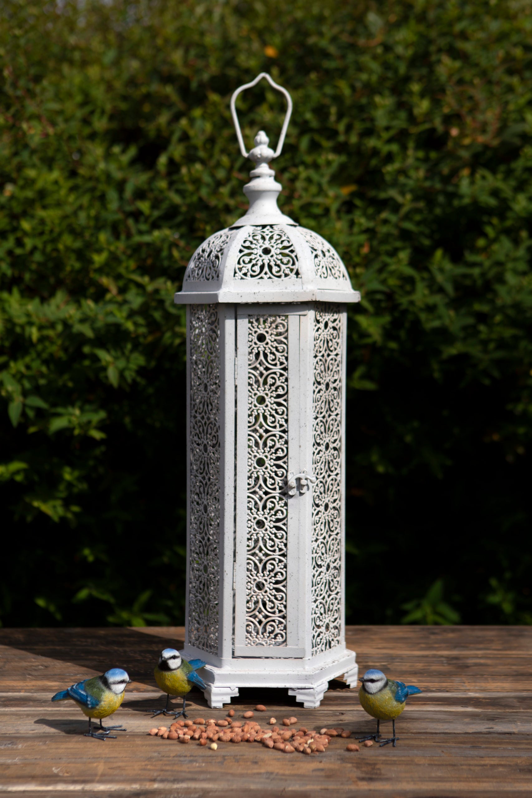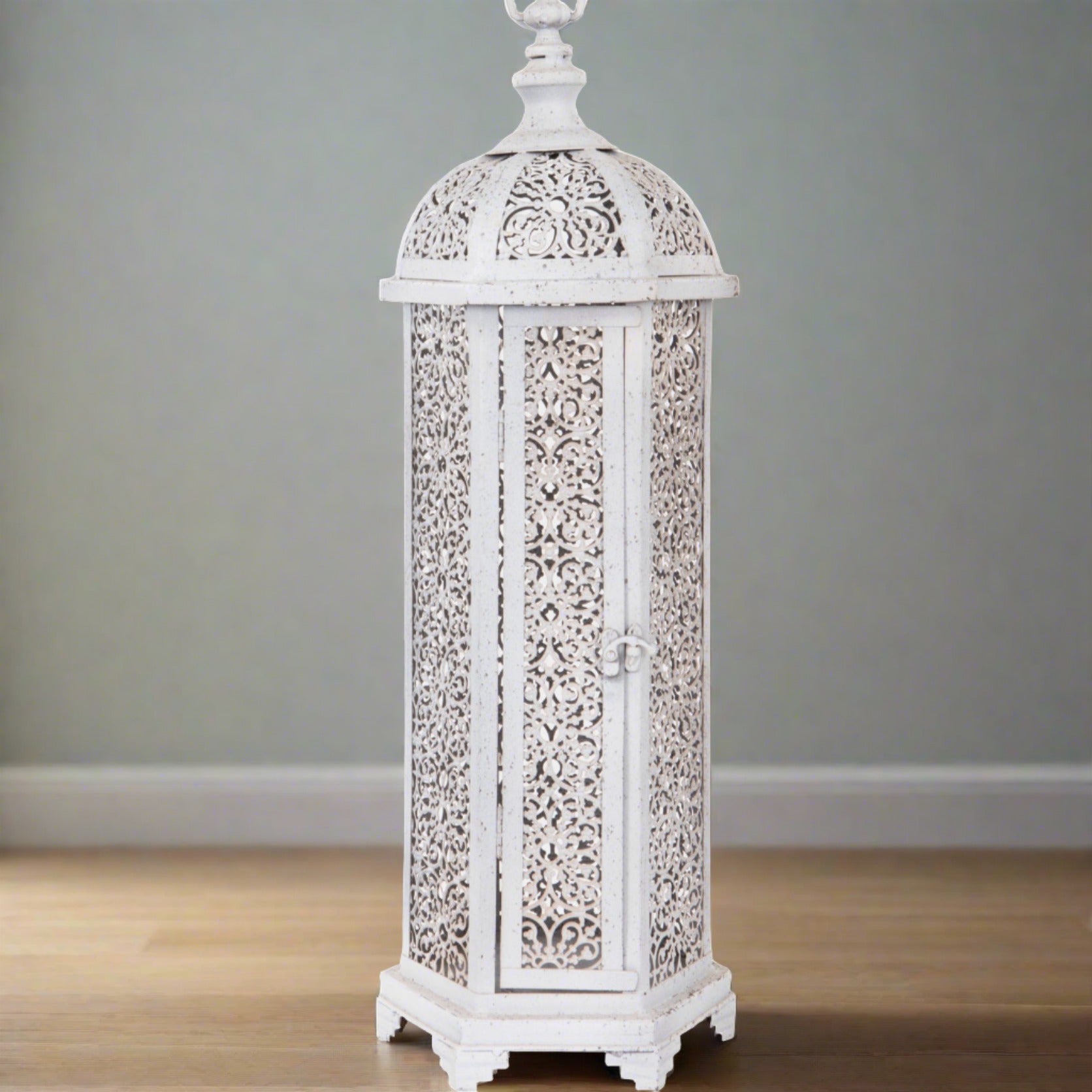 Light up any room or outdoor space with the antique-style Alhambra Lantern! With its aged patina, warm white coloring, and ability to fit both candles and pin-wire lights, this lantern is a timeless addition to any home. Enjoy its rustic beauty indoors or out—it will only get better with age!