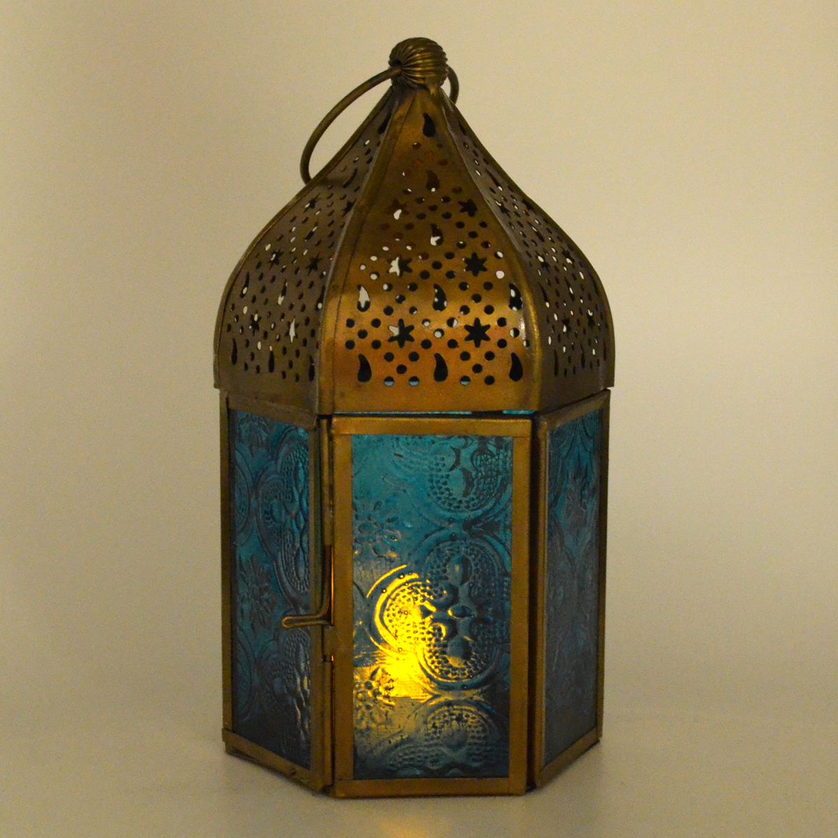 This set of 2 beautiful brass and blue glass Moroccan style lanterns look beautiful bringing an ambient glow to anywhere you wish to create a dramatic middle eastern ambiance. Simply add a tea light to create the most magical lighting effect indoor or outdoor.