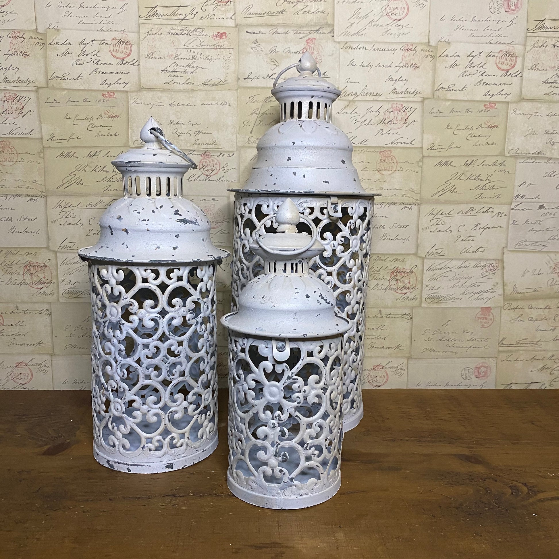This beautiful set of 3 rustic vintage Italian style lanterns will look amazing anywhere in your home or garden. The ornate vintage style rustic metal lanterns are ideal for a real or artificial candle and will bring warmth and perfect mood lighting to any area.